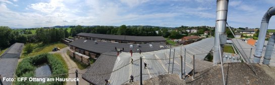 In einem Gewerbebetrieb in der Attnanger Straße, wurde die beschädigte Dachfläche von ca. 7500 m2 mit Planen und Brunnenschaum fertig abgedeckt. Als Unterstützung rückten die Feuerwehren des Abschnittes Schwanenstadt, sowie die Teleskopmastbühnen der Feuerwehren Vöcklabruck und Frankenmarkt für die Absicherung an. Es waren 47 Feuerwehrkamerad/innen im Einsatz. Die Höhenrettungsgruppe der Freiwilligen Feuerwehr Frankenmarkt sicherte zusätzlich mit Seiltechnik die Mannschaften im Absturz gefährdeten Bereich.