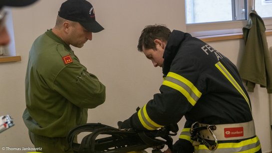 Den ausgeschiedenen Bewertern, Feuerwehrtechniker-A DI (FH) Jürgen Staudinger wurde für seine langjährige Tätigkeit als Leiter der Atemschutz-Leistungsprüfung und Ehren-Oberamtswalter Alfred Hofinger für seine Bewerter Tätigkeit ein Anerkennungsgeschenk überreicht.
