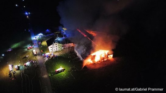 Bereits auf der Anfahrt zum Brandobjekt konnte eine dichte Rauchsäule erblickt werden, kurz nach dem Eintreffen an der Einsatzstelle wurde Alarmstufe 3 ausgelöst. Das landwirtschaftliche Gebäude stand beim Eintreffen der Feuerwehr in Vollbrand, augenscheinlich wurde auch das Wohnhaus vom Feuer in Mitleidenschaft gezogen. Ob und inwieweit das Haus beschädigt wurde ist derzeit noch unklar. Aus dem Stall wurden die Kühe von den Einsatzkräften befreit und in sicherem Abstand zum Brand hinter einen Zaun gebracht. Mehrere Tiere konnten dabei entkommen und wurden von der Feuerwehr wieder eingefangen. Auch hier ist derzeit noch unklar, ob alle Kühe aus dem Stall befreit werden konnten.