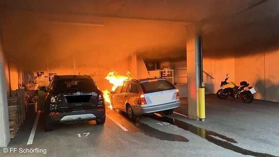 Umgehend rückten beide Feuerwehren zum Einsatzort in den Obstgartenweg aus. Bei der Lageerkundung durch den Einsatzleiter wurde festgestellt, dass nicht die Tiefgarage selbst, sondern ein darin geparkter PKW in Flammen stand.
